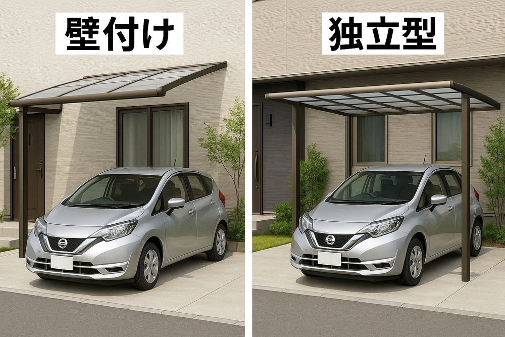 壁付けタイプは、家側の柱を無くし、建物側の壁や梁に専用金物で固定して支持する方法です。柱が少ない分スッキリして見えますし、駐車スペースを広く使えるのが魅力です。ただし、建物の構造を理解したうえで、どの位置で固定すれば安全かを判断できるプロの関与が必須です。メーカー純正の壁付け専用商品(LIXIL・YKK APなど)が出している金物を使い、その仕様書通りに施工してくれる業者でないと不安が残ります。