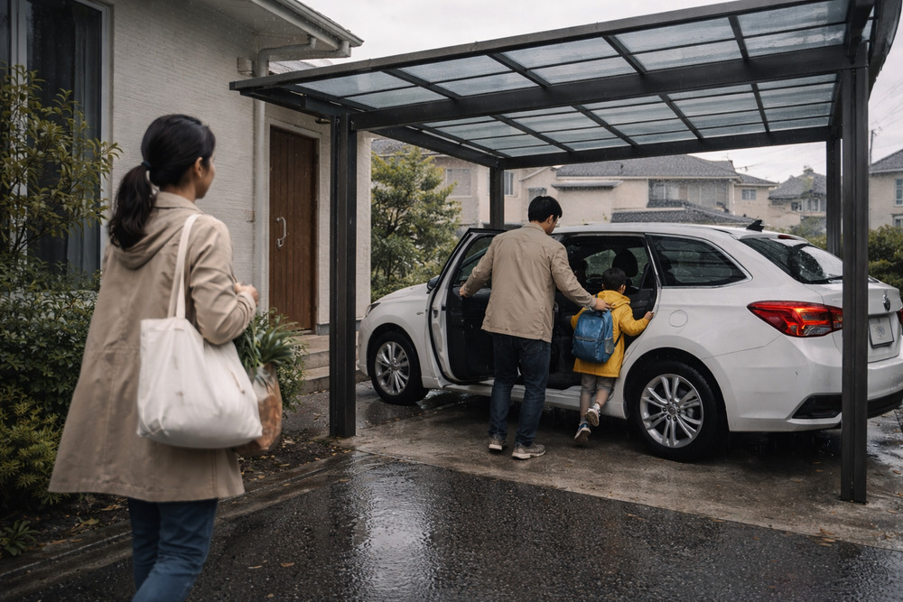 カーポートの強みは、やっぱり雨の日の快適さ直射日光・紫外線の軽減です。小さい子がいる家庭だと、荷物の積み下ろしやチャイルドシートで、ありがたみが出やすいです。雨の日に子どもが濡れてグズる、荷物がびしょびしょになる、これが減るだけで「付けてよかった」になる人も多いです。