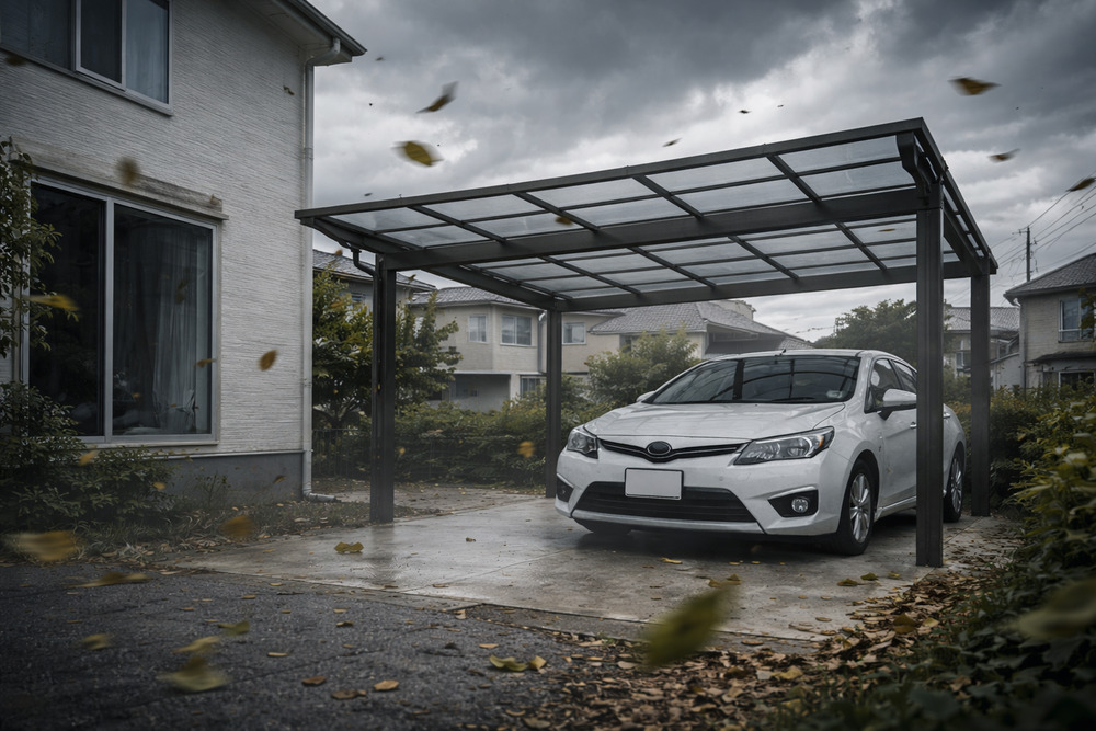 不安が大きくなりやすいのは、沿岸部や風が抜ける立地、周辺に建物が少なく風を遮るものがない場所、そして雪の多いエリアです。こういう条件だと、カーポートは「便利設備」ではなく、外部荷重(風・雪)を受ける構造物として考えないといけません。