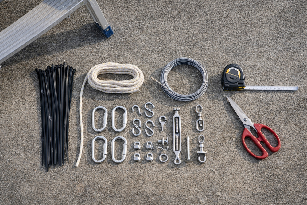 道具は多そうに見えて、実はシンプルです。私は「最低限で設置できるセット」と「強風で暴れないための追加部材」を分けて準備します。