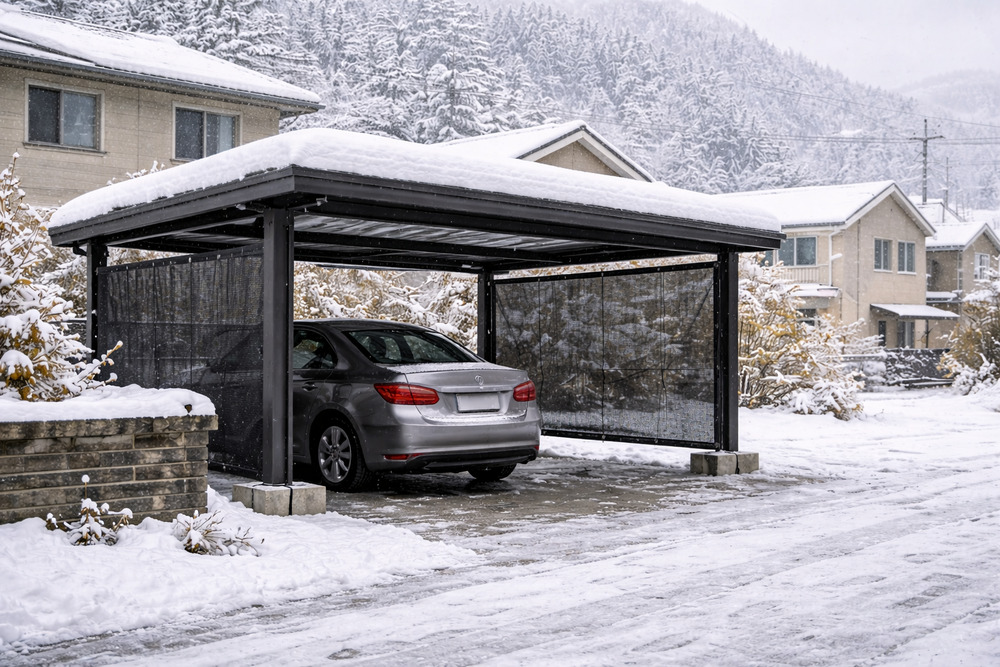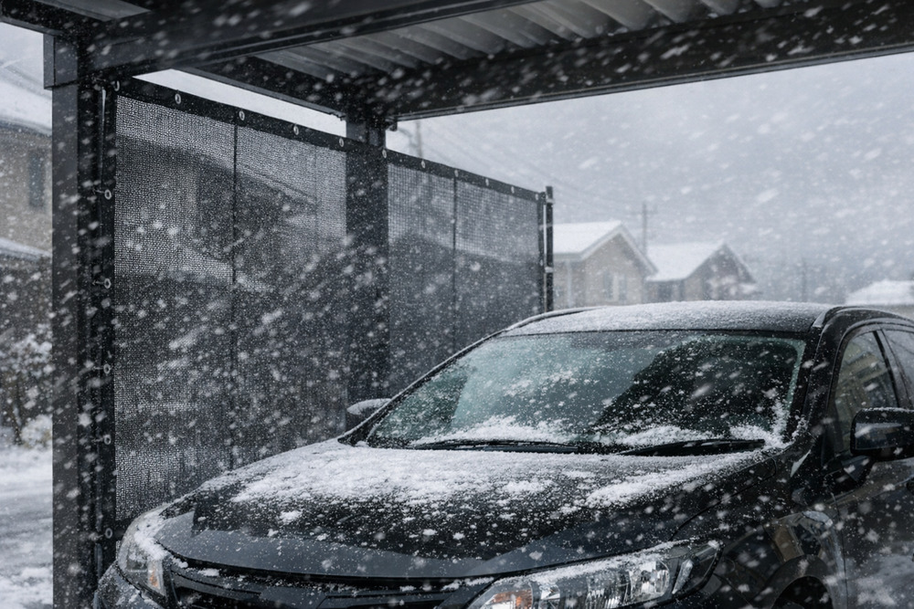 カーポートがあるのに、横殴りの雪や吹雪で車が雪まみれ…これ、けっこう多い悩みですよね。屋根は上からの雪を防げても、風に乗って入ってくる粉雪や地吹雪までは止めきれないことが多いです。