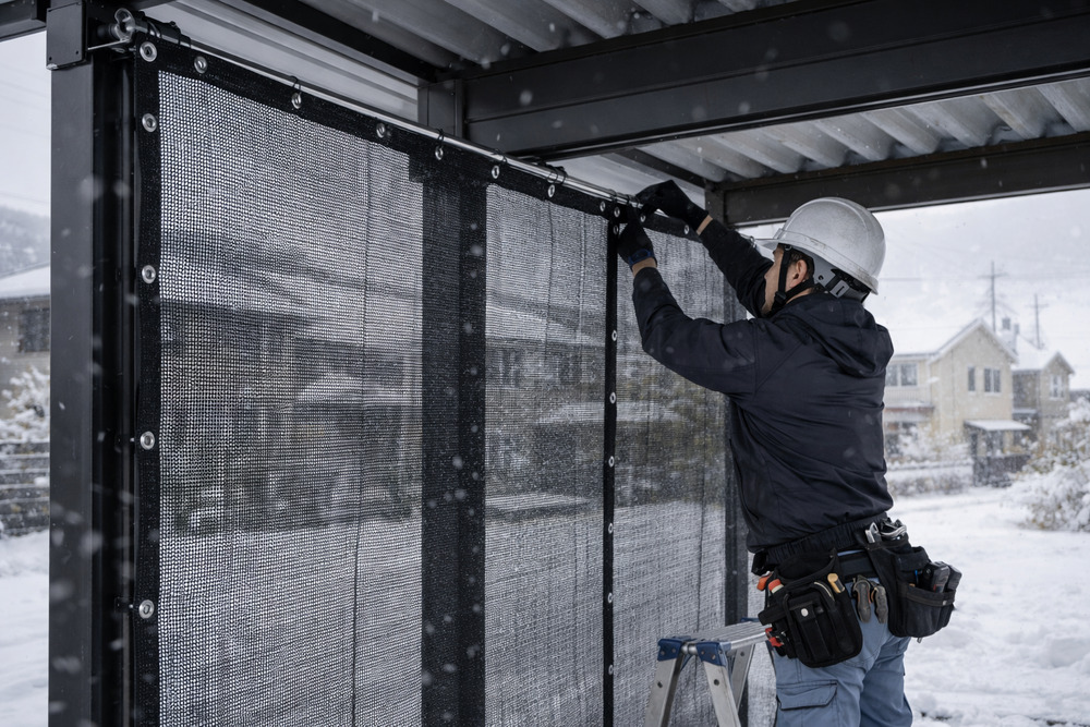 柱との間、地面との間に隙間があると、そこから雪が吹き込みます。対策は固定点を増やす、下端に重りを付ける、必要ならサイズを見直す。ここでやりがちなのが「引っ張りすぎ」。風圧トラブルの元なので、ほどよい加減が大事です。