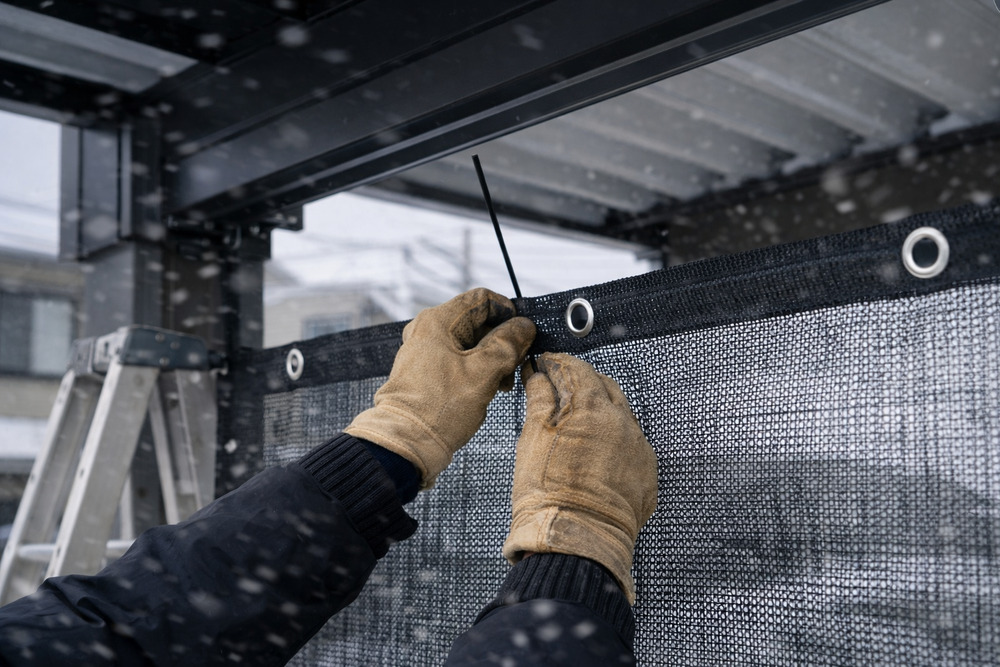 防雪ネットはメッシュで風を逃がしますが、それでも面積が大きいと風圧はかかります。固定箇所が少ないと、結束バンドが切れる→ハトメが裂ける→フレーム側に負担が寄る、という順でトラブルになりがちです。